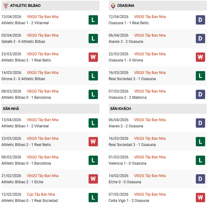 - Trên sân nhà, Athletic Bilbao thắng 3, thua 2 trước Osasuna.