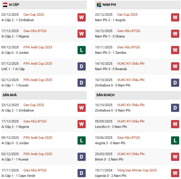 Thành tích đối đầu Ai Cập vs Nam Phi: