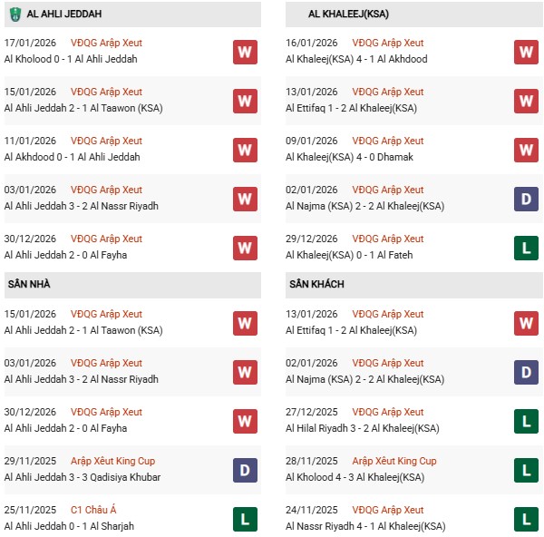 Về phong độ, Al Ahli thắng 6, hòa 1 và thua 3 trong 10 trận gần nhất trên mọi đấu trường, phản ánh sự ổn định tương đối cao. Trên sân nhà, họ cũng thể hiện bản lĩnh tốt với 5 chiến thắng, 3 trận hòa và chỉ 2 thất bại trong 10 trận gần đây, đủ để tạo niềm tin trước cuộc tiếp đón Al Khaleej.