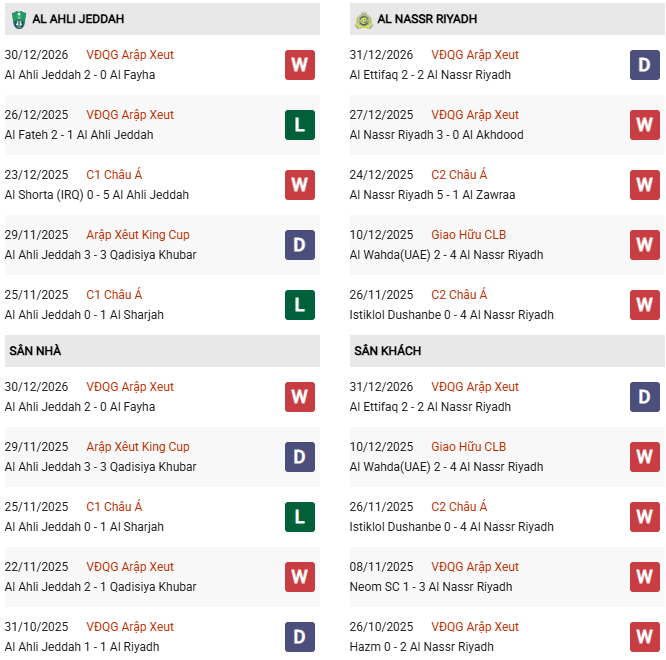 Thống kê phong độ Al Ahli vs Al Nassr: