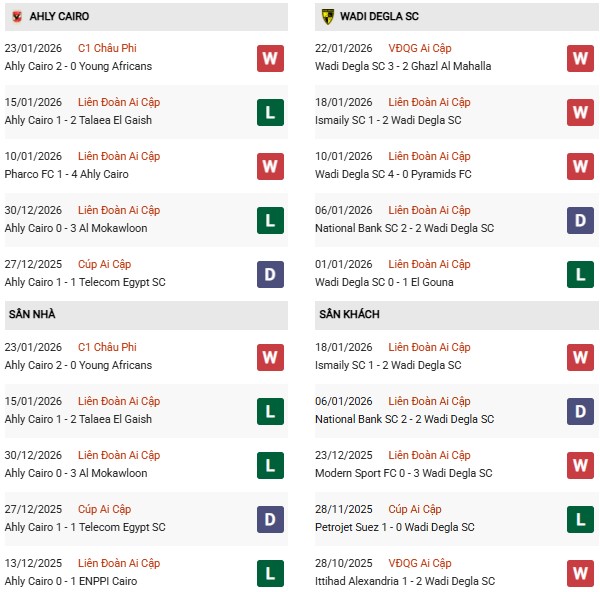 Phong độ 10 trận gần nhất của họ trên mọi đấu trường khá tích cực với 5 chiến thắng, 2 trận hòa và 3 thất bại. Đáng chú ý, trên sân khách Wadi Degla vẫn duy trì được sự tự tin khi thắng 5, hòa 2 và thua 3 trong 10 chuyến hành quân gần đây, đủ để họ trở thành đối thủ không dễ bị khuất phục.