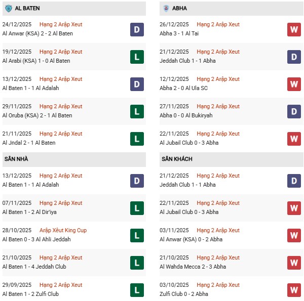 - Trên sân nhà, Al-Baten thắng 5, thua 3 trước Abha.