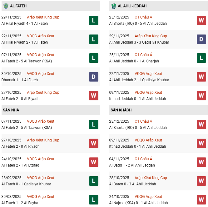 Thống kê phong độ Al-Fateh vs Al Ahli: