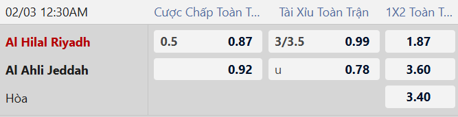 Thông tin tỷ lệ kèo Al Hilal vs Al Ahli: