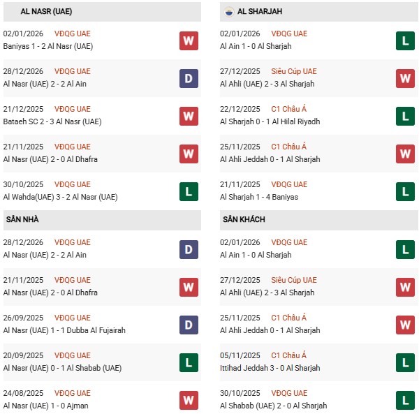- Trên sân nhà, Al Nasr Dubai thắng 4, thua 6 trước Al Sharjah.