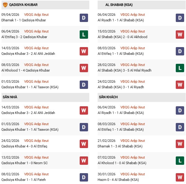 - Al Qadisiya thắng 4, hòa 1, thua 5 trong 10 trận gặp Al Shabab gần đây.