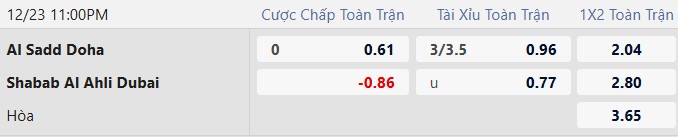 Thông tin tỷ lệ kèo Al Sadd vs Shabab Al Ahli: