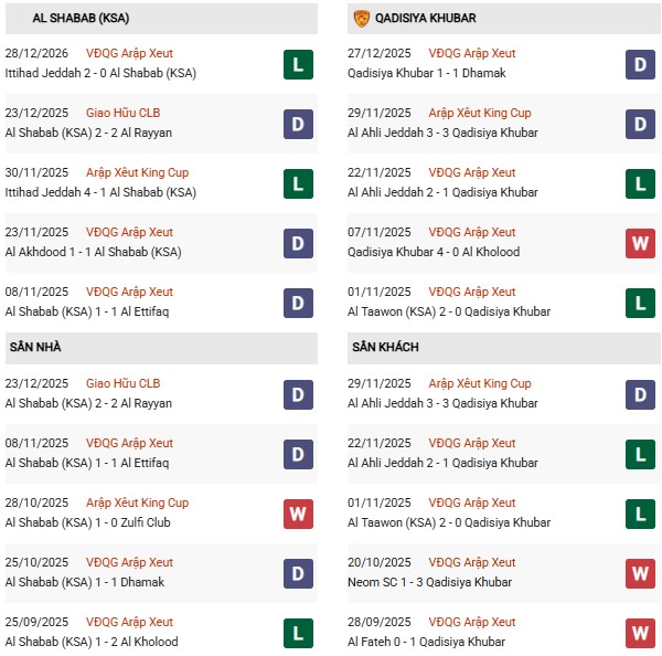 Phong độ gần đây của Al Qadisiya khá ổn định với 5 thắng, 3 hòa và 2 thua trong 10 trận gần nhất. Tuy nhiên, thành tích sân khách của họ chưa thực sự ấn tượng khi chỉ thắng 2, hòa 4 và thua 4 trong 10 chuyến hành quân gần đây. Dù vậy, Al Qadisiya vẫn được đánh giá cao hơn nhờ lối chơi tổ chức tốt, khả năng kiểm soát thế trận và chất lượng đội hình nhỉnh hơn so với Al Shabab.