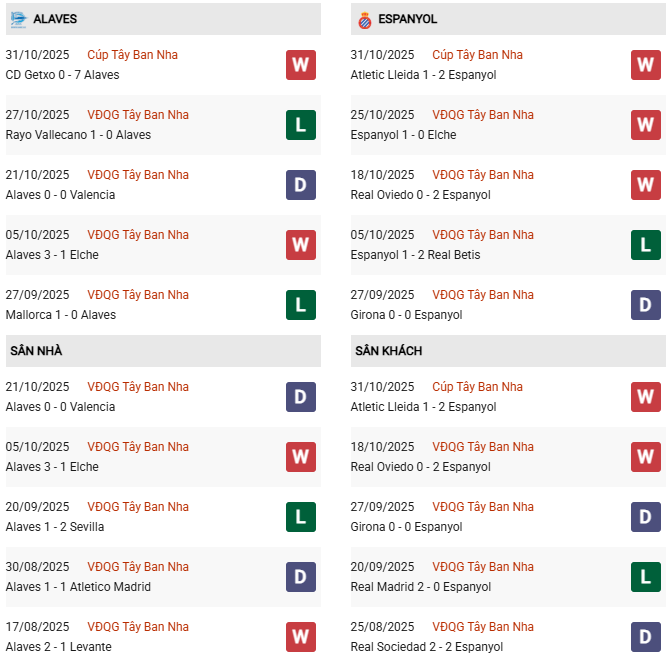 - Alaves thắng 3, hòa 2, thua 5 trong 10 trận gặp Espanyol gần đây.