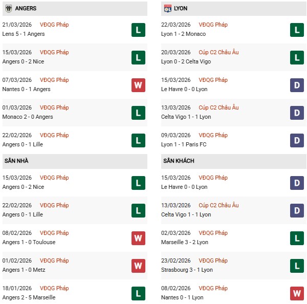 Thống kê phong độ Angers vs Lyon: