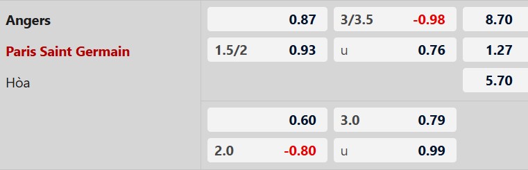 Thông tin tỷ lệ kèo bóng đá Angers vs PSG: