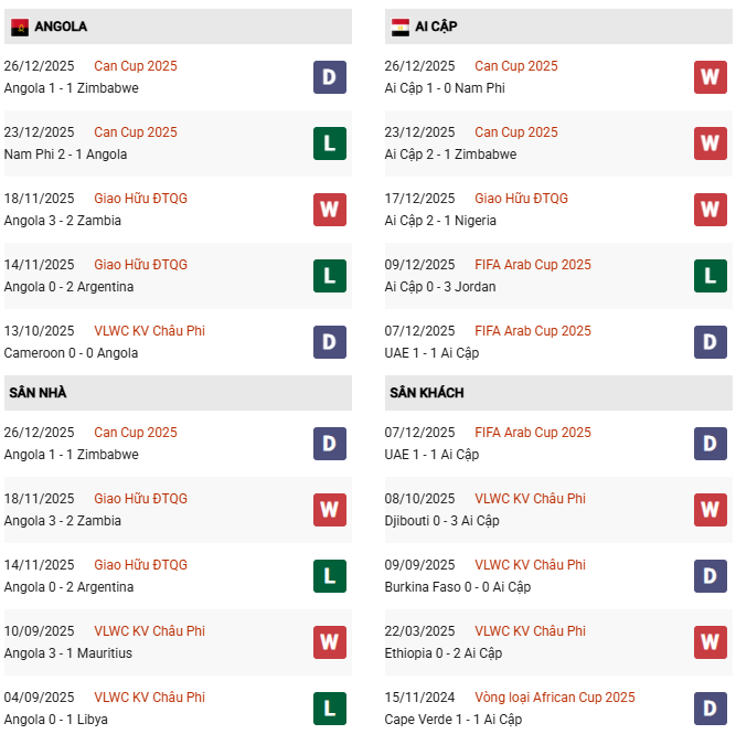- 4 lần gần nhất gặp nhau, Ai Cập thắng 2 và hòa 2 trước Angola.