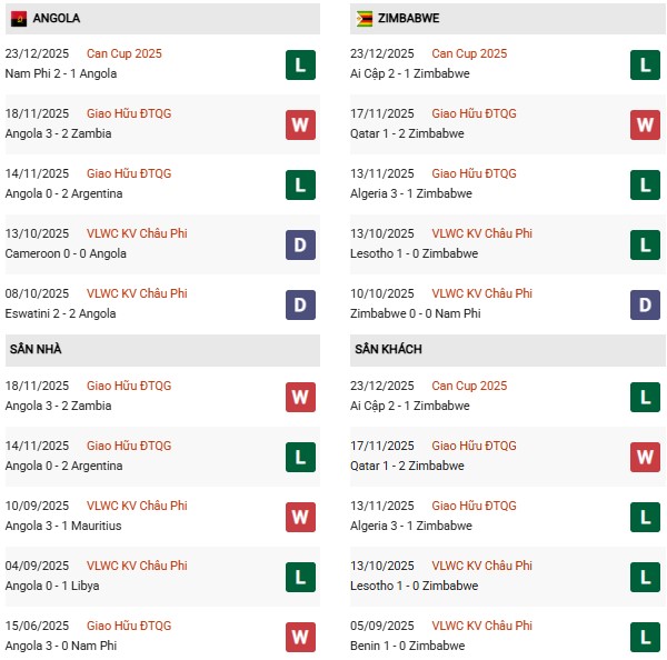 Thống kê phong độ Angola vs Zimbabwe: