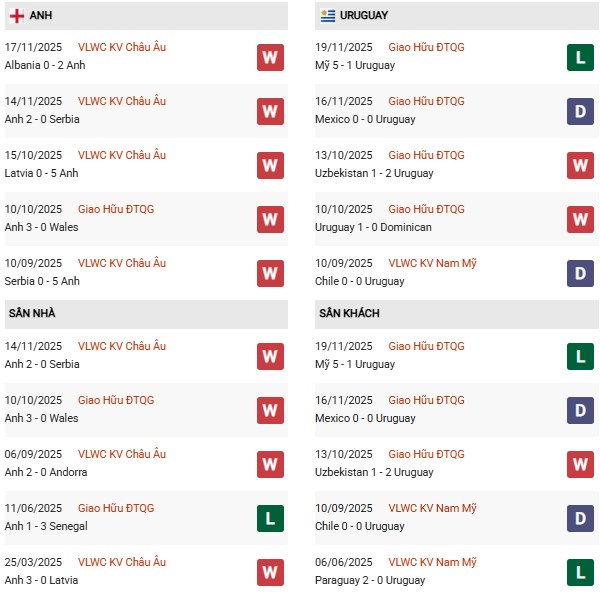 Thống kê phong độ Anh vs Uruguay: