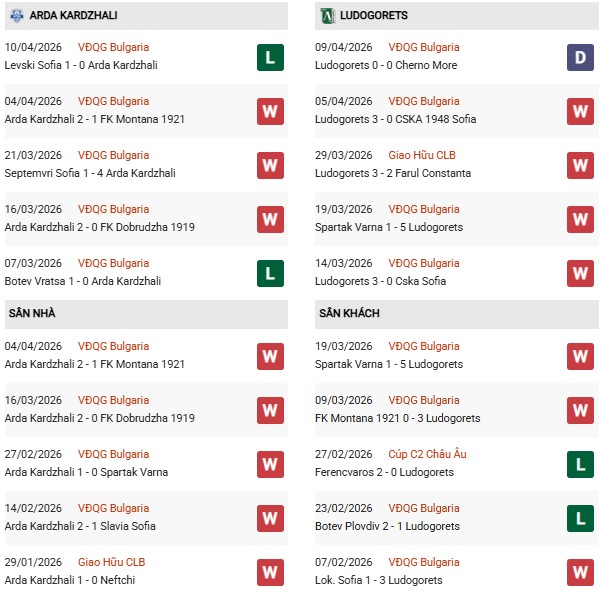 Thống kê phong độ Arda Kardzhali vs Ludogorets: