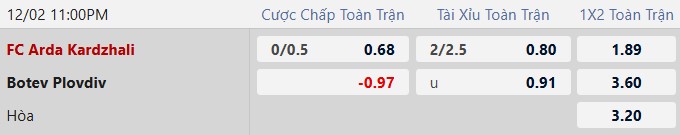 Thông tin tỷ lệ kèo Arda vs Botev Plovdiv: