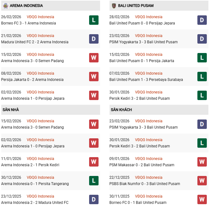 - Trên sân nhà, Arema thắng 7, thua 2 trước Bali United.