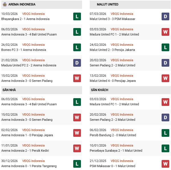 Thống kê phong độ Arema vs Malut United: