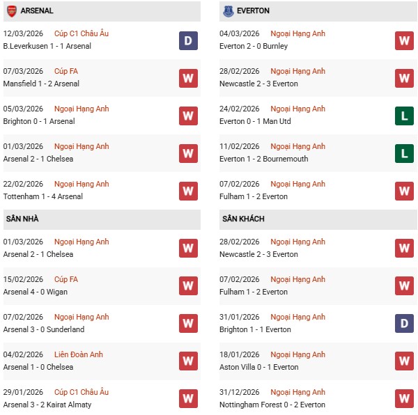 Thống kê phong độ Arsenal vs Everton:
