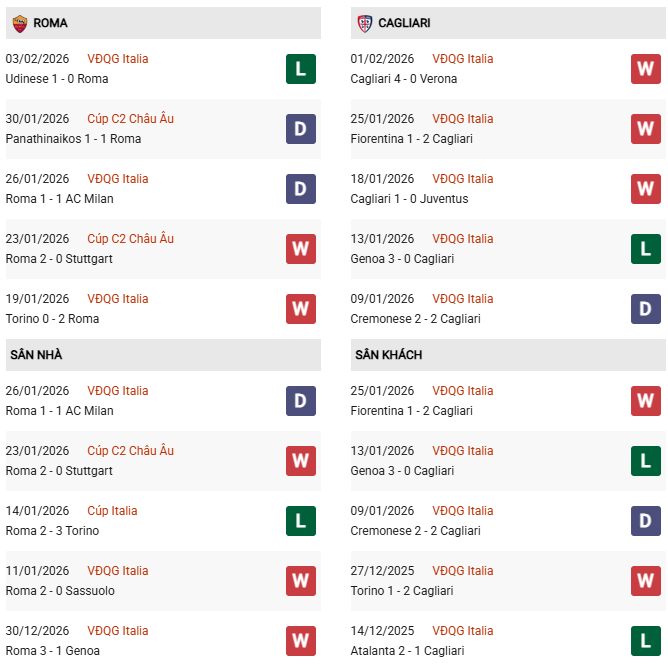 Tuy nhiên, sự thăng hoa này chủ yếu đến từ sân nhà, còn phong độ sân khách vẫn là bài toán khó giải đối với đội bóng đảo Sardinia. Trong các chuyến hành quân xa nhà mùa này, Cagliari thường bộc lộ sự thiếu tập trung ở hàng thủ và đã nhận những thất bại đau đớn trước Genoa hay Atalanta. Dù đang có tâm lý hưng phấn, nhưng việc phải đối đầu với một Roma đầy bản lĩnh tại Olimpico sẽ là thử thách ở đẳng cấp hoàn toàn khác cho Cagliari.