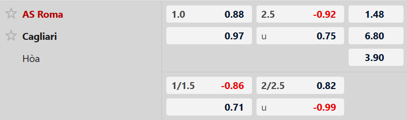 Thông tin tỷ lệ kèo AS Roma vs Cagliari: