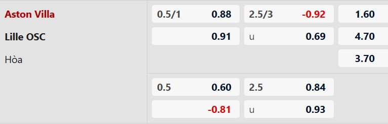 Thông tin tỷ lệ bóng đá Aston Villa vs Lille: