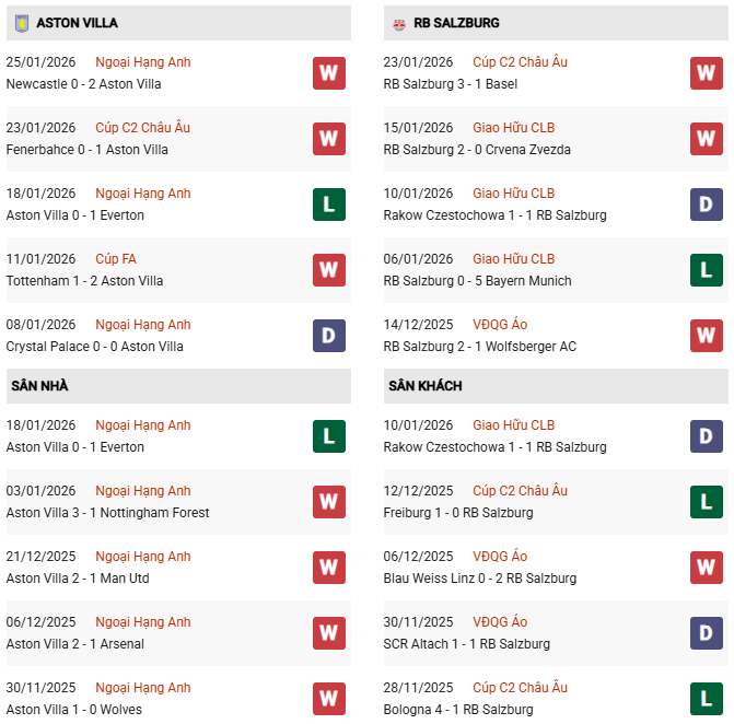 Thống kê phong độ Aston Villa vs RB Salzburg: