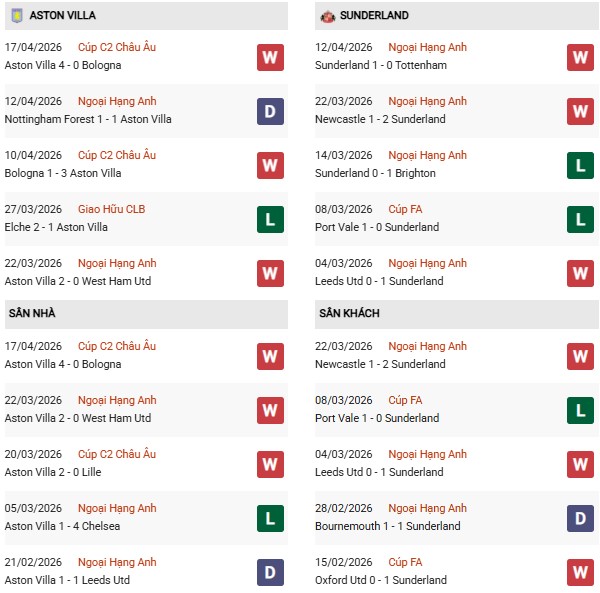 - Trên sân nhà, Aston Villa thắng 3, thua 2 trước Sunderland.