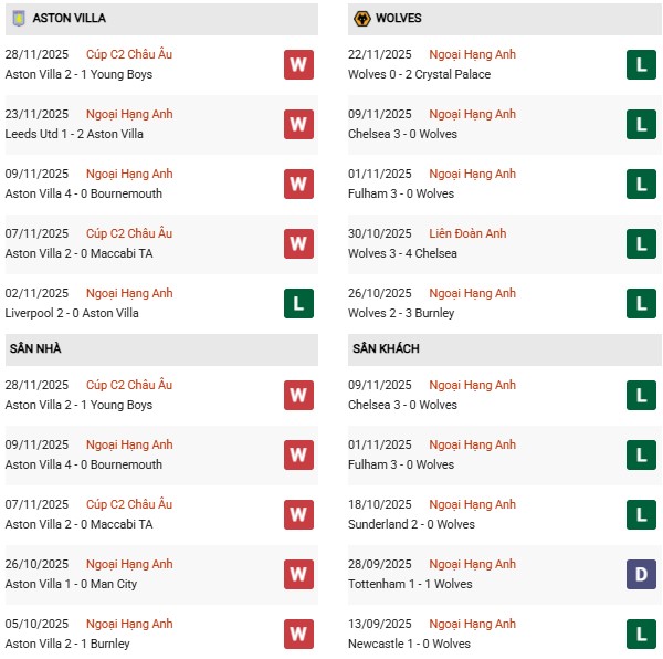 - Trên sân nhà, Aston Villa thắng 4, thua 2 trước Wolves.