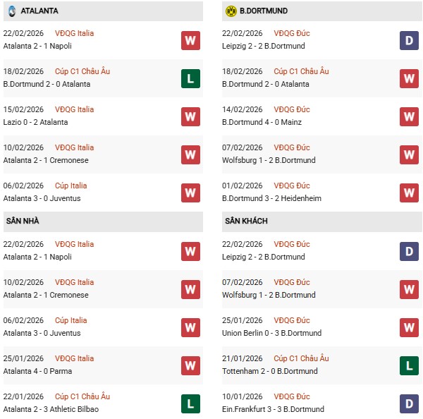 Thống kê phong độ Atalanta vs Dortmund: