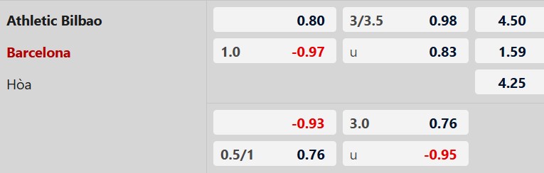 Soi kèo châu Á Athletic Bilbao vs Barcelona: