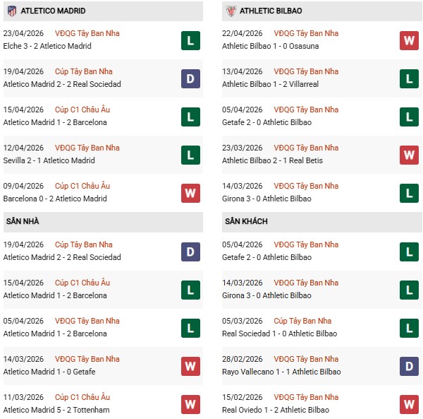 Thống kê phong độ Atletico Madrid vs Bilbao: