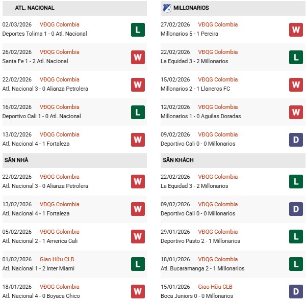 - Trên sân nhà, Atletico Nacional thắng 1, thua 4 trước Millonarios.