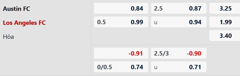 Thông tin tỷ lệ bóng đá Austin vs Los Angeles FC: