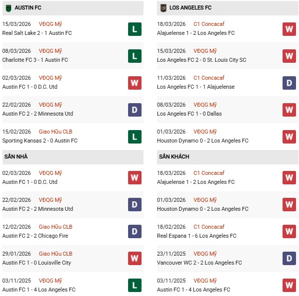 - Austin thắng 2, hòa 2, thua 6 trong 10 trận gặp Los Angeles FC gần đây.