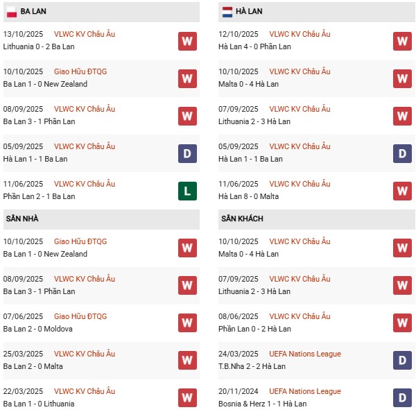 Đáng chú ý, Ba Lan đã ghi bàn trong cả 6 trận gần nhất, tổng cộng 10 bàn thắng và chỉ để lọt lưới 4 lần. Hàng công duy trì sự ổn định, nhưng hàng thủ vẫn còn những thời điểm thiếu tập trung, điều họ cần cải thiện nếu muốn giữ điểm trước đối thủ mạnh như Hà Lan.