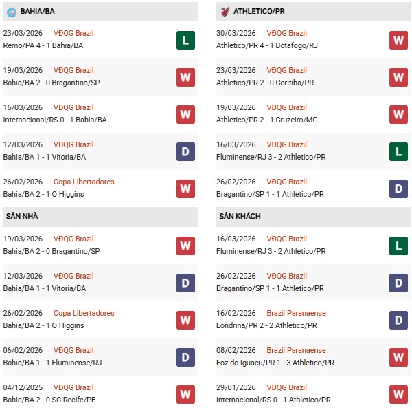 Chiến thắng 4-1 trước Botafogo ở vòng gần nhất tiếp tục cho thấy hàng công của Paranaense đang vào phom, đặc biệt khả năng tận dụng cơ hội rất sắc bén. Dù thành tích sân khách chưa thực sự ổn định, nhưng việc từng thắng trên sân Internacional và ghi 2 bàn vào lưới Fluminense cho thấy đội khách hoàn toàn đủ sức chơi sòng phẳng với Bahia.