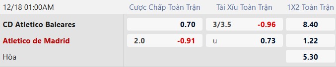 Thông tin kèo bóng đá Baleares vs Atletico Madrid: