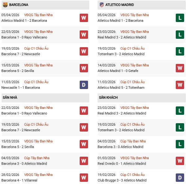 Thống kê phong độ Barcelona vs Atletico Madrid: