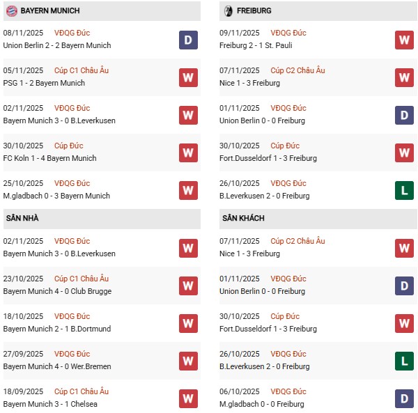 - Trên sân nhà, Bayern Munich thắng 8, thua 1 trước Freiburg.