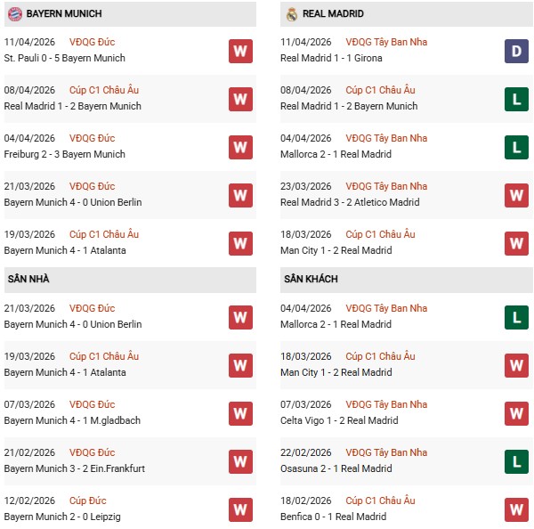 Thống kê phong độ Bayern Munich vs Real Madrid: