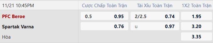 Thông tin tỷ lệ bóng đá Beroe vs Spartak Varna: