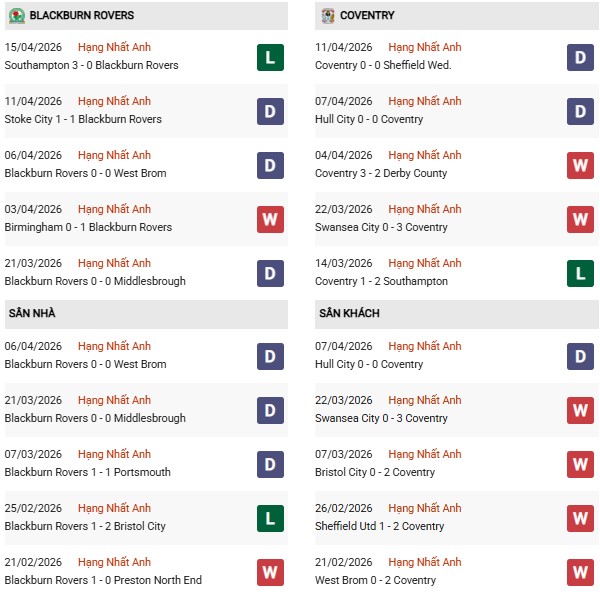 - Blackburn hòa 5, thua 5 trong 10 trận gặp Coventry gần đây.