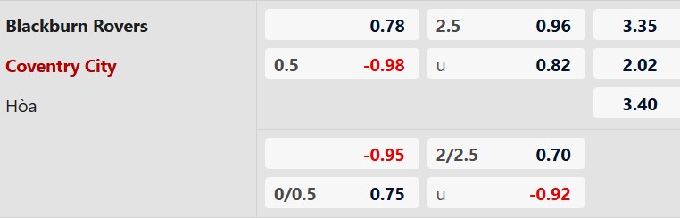Thông tin tỷ lệ bóng đá Blackburn vs Coventry:
