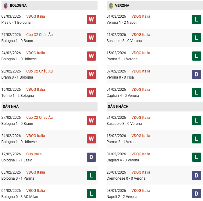 - Trên sân nhà, Bologna thắng 6, thua 2 trước Verona.