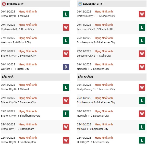 - Trên sân nhà, Bristol City thắng 3, thua 2 trước Leicester.