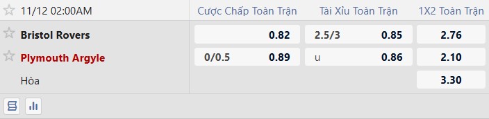 Thông tin tỷ lệ bóng đá Bristol Rovers vs Plymouth: