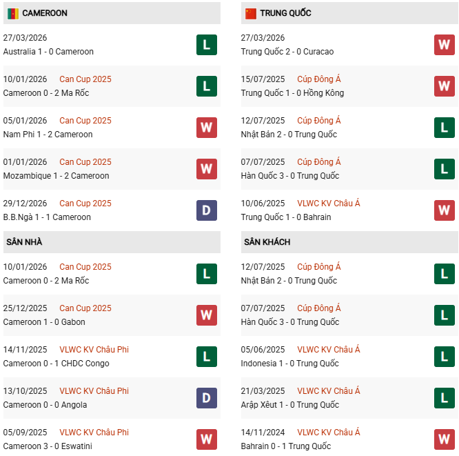 Thành tích đối đầu Cameroon vs Trung Quốc: