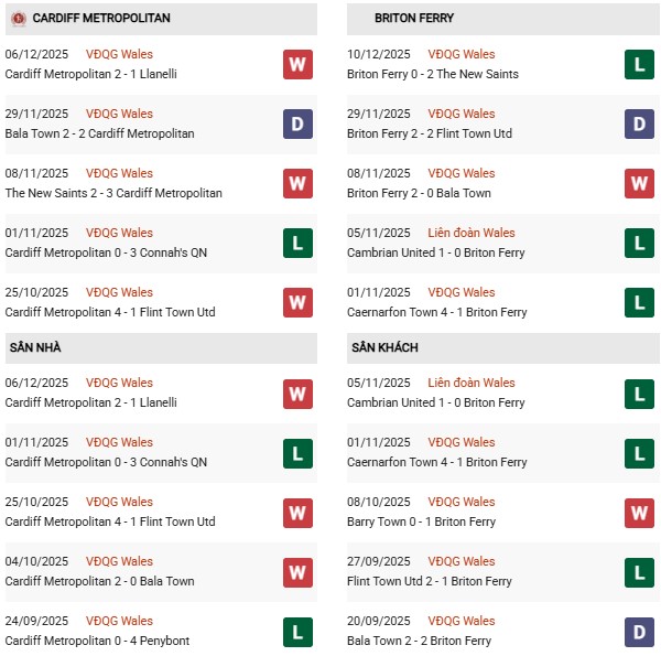 Phong độ hiện tại của Briton Ferry khá đáng lo ngại khi chỉ thắng 2, hòa 2 và thua tới 6 trong 10 trận gần nhất. Dù vậy, thành tích sân khách của đội bóng này không quá tệ với 3 chiến thắng, 3 trận hòa và 4 thất bại trong 10 chuyến xa nhà gần đây. Tuy nhiên, việc thường xuyên mất tập trung ở giai đoạn cuối trận khiến Briton Ferry khó giữ được thế trận trước những đối thủ có động lực rõ ràng như Cardiff Met.