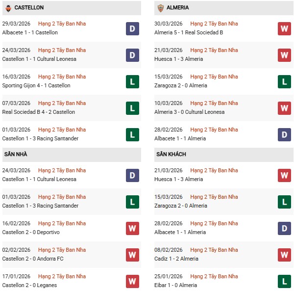 - Trên sân nhà, Castellon thắng 2, thua 1 trước Almeria.